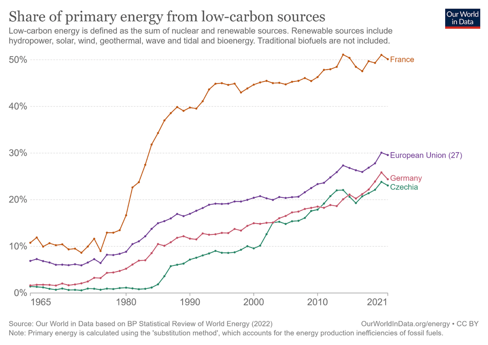 Ani v porovnání s dalšími evropskými zeměmi, obzvláště po započtení investic, nevypadá německý energetický profil nízkoemisních zdrojů úplně oslnivě. Německo není zásadně vzdálené od Česka, leží pod unijním průměrem a hluboko pod Francií.