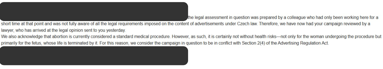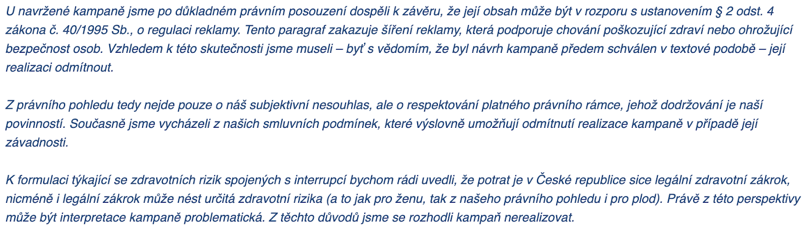 „Zveřejňování informací o umělém přerušení těhotenství, které bylo cílem kampaně, rozhodně není reklamou, a už vůbec ne reklamou na zdravotní zákrok. Navíc poskytovat informace o legálním zdravotním zákroku rozhodně není podpora chování poškozujícího zdraví,“ rozvádí odbornice, která na FF UK působí jako ombudsmanka.
