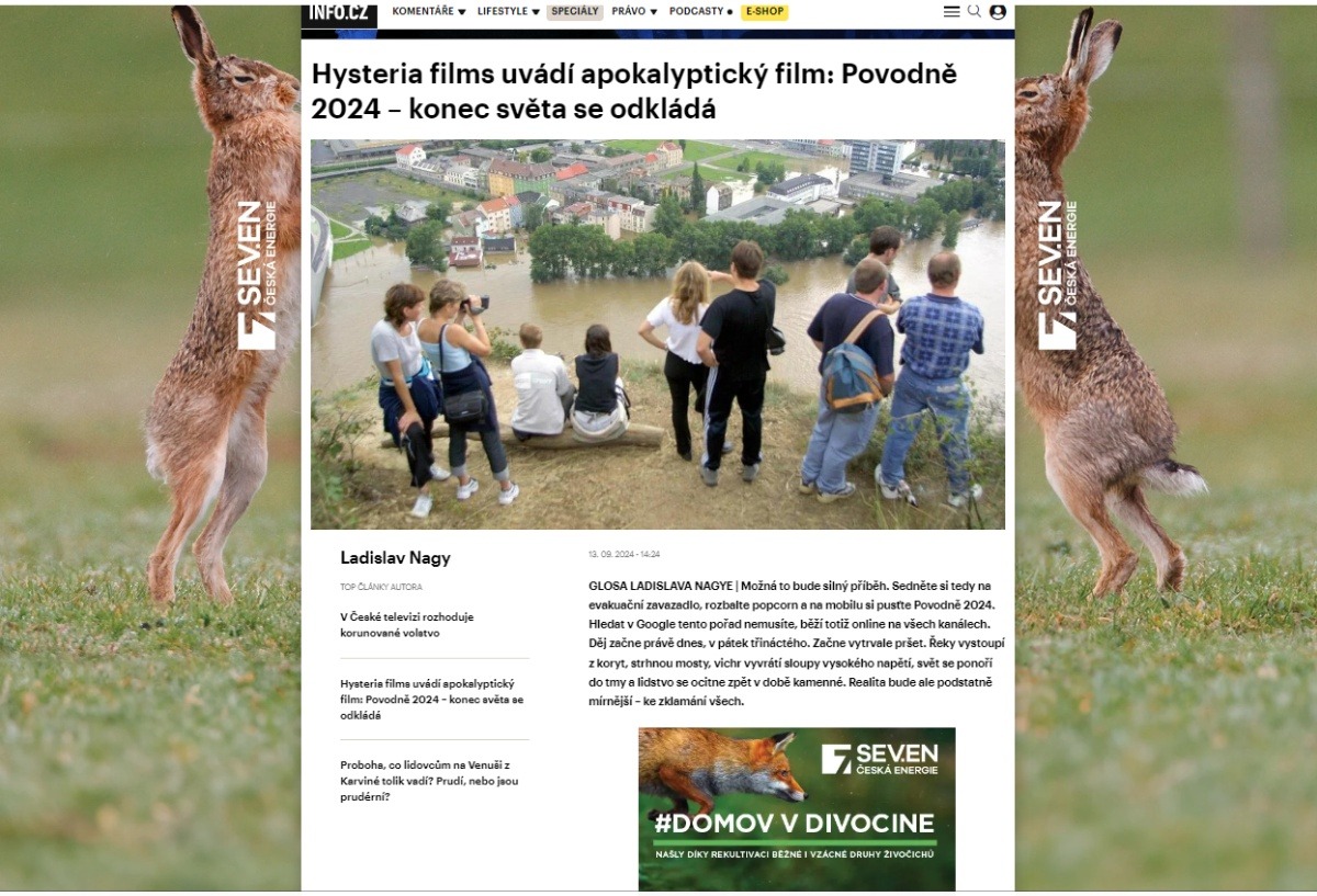V době, kdy předpovědní modely začaly ukazovat, že na severu Moravy mají za pouhých několik dní napadnout až dvě třetiny srážek, které normálně napadnou za celý rok, následoval další článek: Hysteria films uvádí apokalyptický film: Povodně 2024 – konec světa se odkládá Ladislava Nagyho.