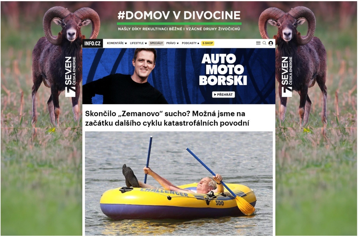 Radujte se z povodně, radí Pavel Vondráček v době přicházející velké vody na pozadí greenwashingové reklamy na fosilní průmysl | Zdroj: Úvodní stránka Info.cz