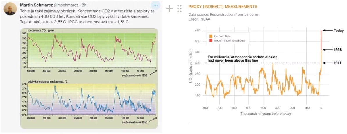 Schmarcz „dokládá“ údajně nevýznamnou hladinu oxidu uhličitého v atmosféře grafem nezobrazujícím současné úrovně – ty jsou pro srovnání v pravém grafu