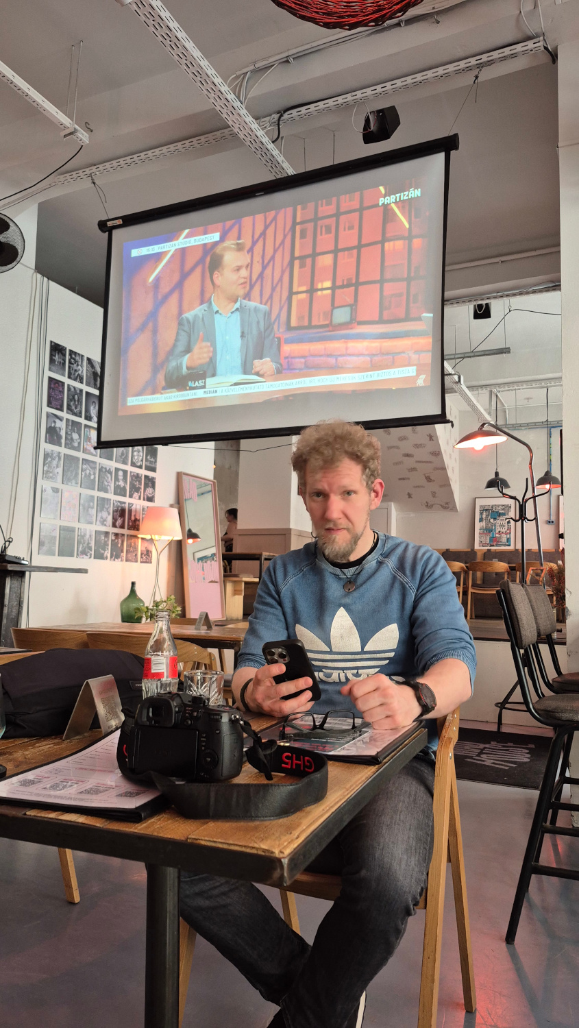 Z hovoru nás vyrušuje vzruch publika. Na obrazovce se promítnou exit polls. Poprvé za život party puberťáků je oranžový sloupek Fidesz menší než jakákoli opozice. Modrá Tisza je vpředu. Hodně.