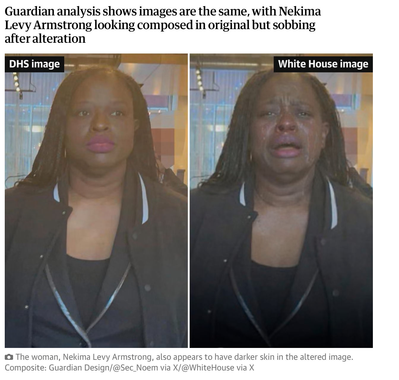 Původní snímek sdílela ve čtvrtek ráno ministryně vnitřní bezpečnosti Kristi Noem. Zatčená žena na něm má neutrální výraz. Verze publikovaná Bílým domem vypadá podobně, ale ženin obličej je změněn. Na upravené verzi má také tmavší barvu kůže, než odpovídá realitě.